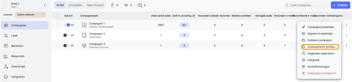 Wil je je campagnes voorzien van verse leads? De functie "Zoekopdracht vernieuwen" in de Sales Engagement Tool is er om je te helpen! 🔄 Voer je zoekopdracht opnieuw uit om nieuwe leads binnen te halen die aan je criteria voldoen. Toegang krijgen door op het menu met drie stippen te klikken, "Zoekopdracht vernieuwen" te kiezen, of via het tabblad Bewerken. Stel je gewenste vernieuwingsfrequentie in voor doorlopende updates. Als je liever leads toevoegt met een CSV of nieuwe Zoek-URL, bekijk dan onze 'Nieuwe Leads Toevoegen' gids. Verhoog je bereik en houd het impactvol! ✨