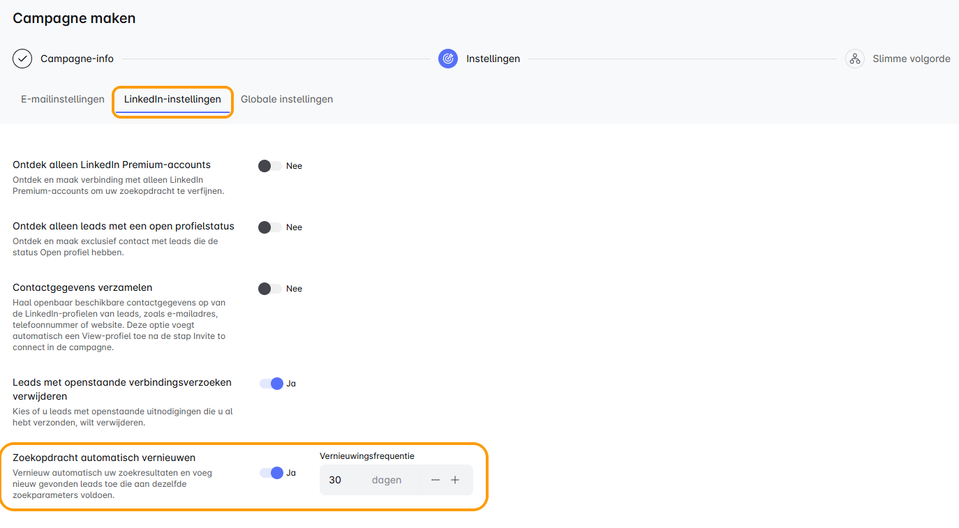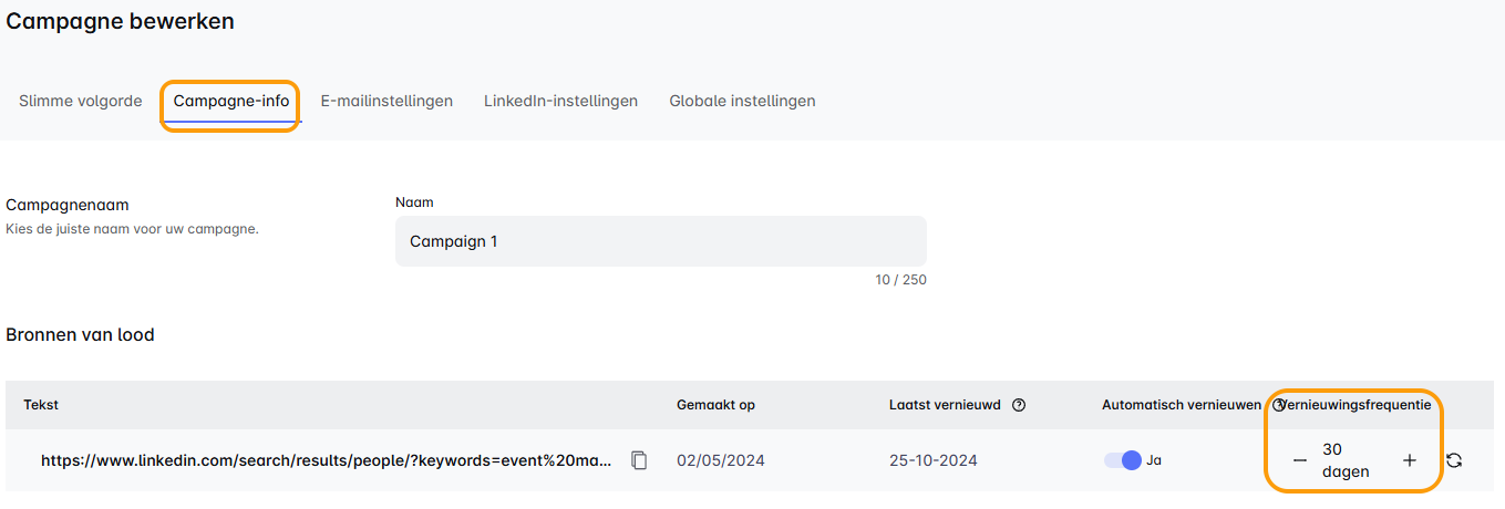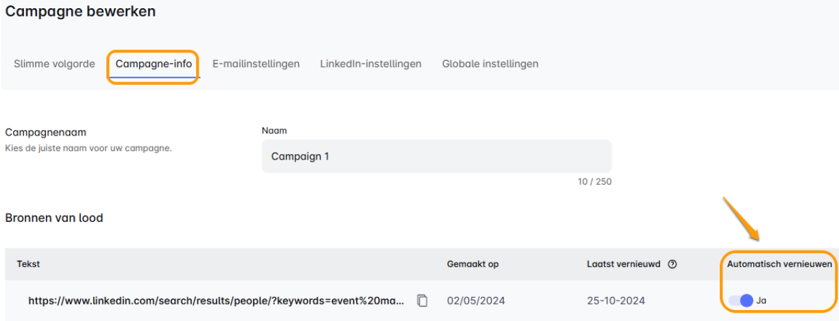 Op het tabblad 'Campagne-info', zie je hier de optie om Zoekopdracht vernieuwen in te schakelen: