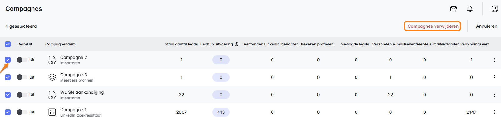 - Om meerdere campagnes tegelijk te verwijderen, selecteer je de campagnes die je wilt verwijderen en klik je op de knop 'Campagnes verwijderen'.
