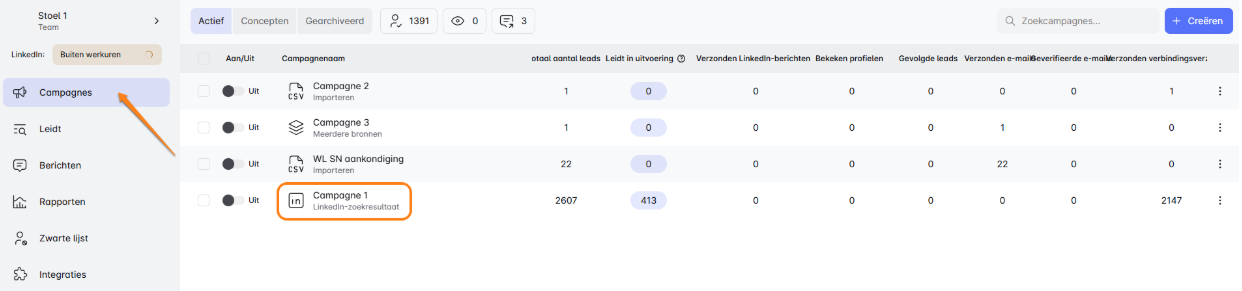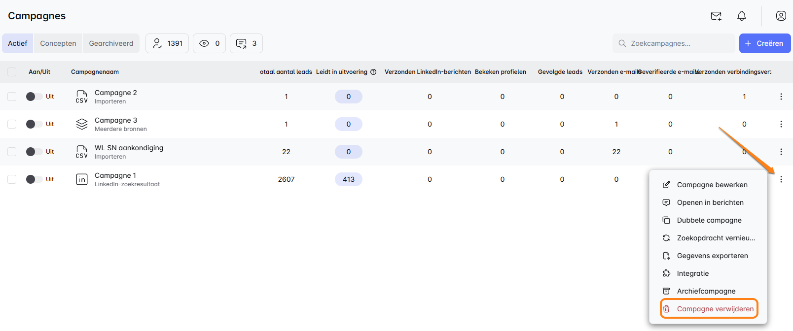 - Navigeer naar het Campagne-dashboard en zoek de campagne die je wilt verwijderen.
