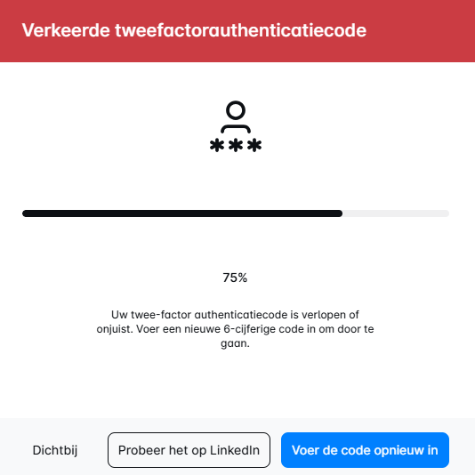 Soms, tijdens de onboarding, zie je mogelijk een 'Twee-factor auth fout' status. Dit gebeurt meestal als de code die je hebt ingevoerd ongeldig is, omdat deze is verlopen (na 1 minuut) of niet correct is ingevoerd.