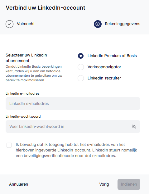 - Na het selecteren van je proxy, ga je verder en voer je je LinkedIn-abonnementstype in samen met je LinkedIn-e-mailadres en wachtwoord. 📧 Als er een PIN nodig is, voer deze dan in om de verbinding af te ronden.
