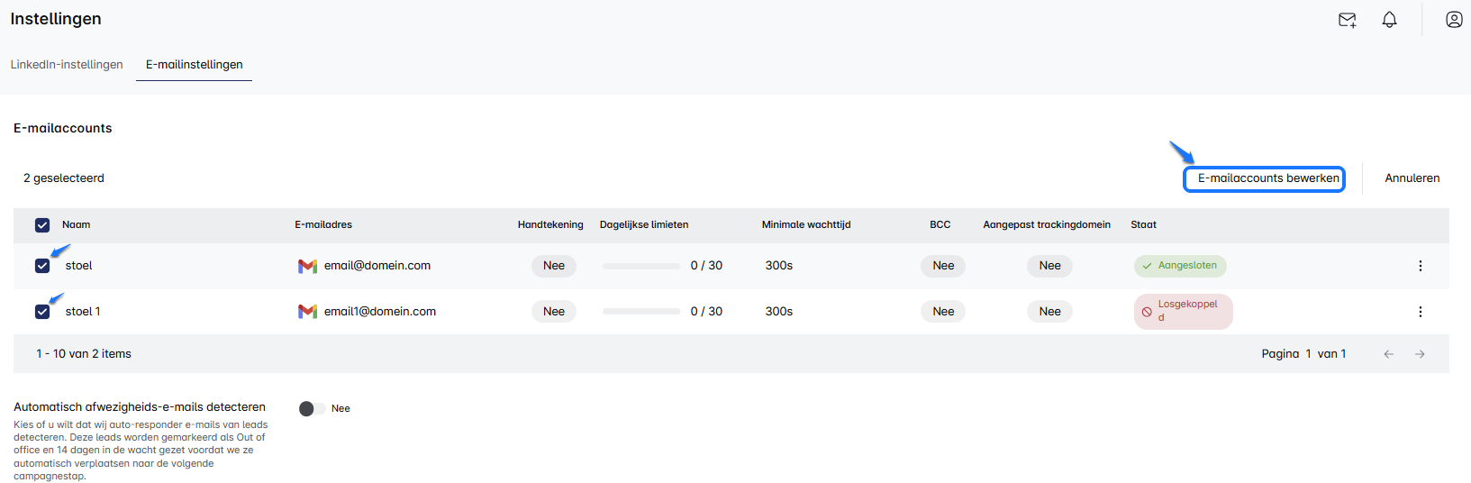 Ga eerst naar het tabblad Instellingen en zoek de sectie E-mailinstellingen. Selecteer de e-mailaccounts die je in bulk wilt bijwerken. -