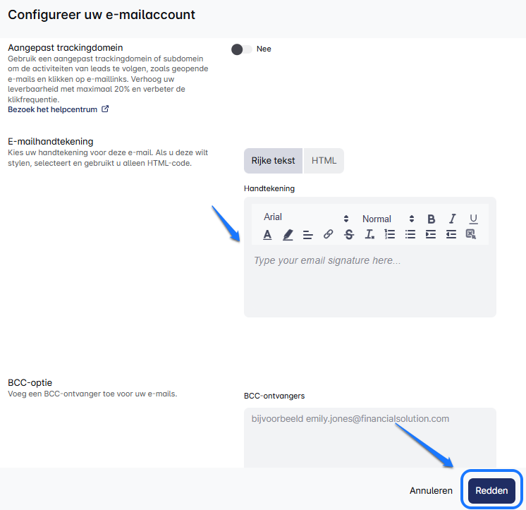 Maak de nodige aanpassingen - Naam, Dagelijkse limieten, Aangepast trackingdomein, Handtekening of BCC-optie en voilà! 🎯 Uw updates worden direct toegepast op alle geselecteerde e-mailaccounts.