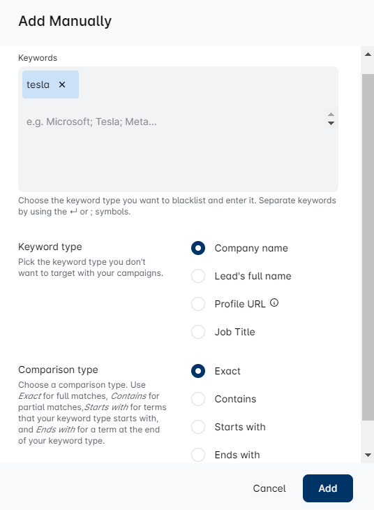 - Exata - Adicione um termo que corresponda totalmente ao tipo de lista negra selecionado para evitá-lo. Isso significa que o valor do arquivo CSV será adicionado à lista negra exatamente como está escrito. Por exemplo, se o nome da empresa que você deseja evitar tiver um LLC no LinkedIn, você precisa adicionar o LLC ao nome da empresa no arquivo CSV. Isso também se refere aos URLs de Perfil que você carrega via arquivo CSV. Você só pode selecionar o tipo de comparação Exata com este item.