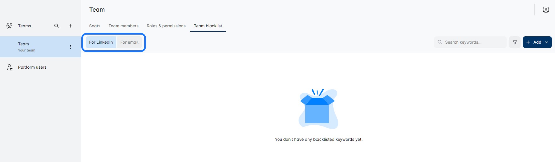 - Contém - Adicione um termo que esteja contido dentro do tipo de lista negra selecionado para evitá-lo. Isso significa que você pode adicionar uma palavra para um nome de empresa, um cargo, etc., e a ferramenta evitará tudo que contenha essa palavra.