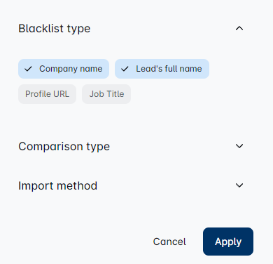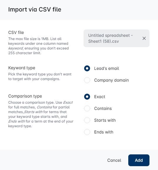 - Exato - Adicione um termo que corresponda totalmente ao tipo de lista negra selecionado para evitá-lo. Isso significa que o valor do arquivo CSV será adicionado à lista negra exatamente como está escrito. Por exemplo, se o nome da empresa que você deseja evitar tem um LLC no LinkedIn, você precisa adicionar o LLC ao nome da empresa no arquivo CSV.