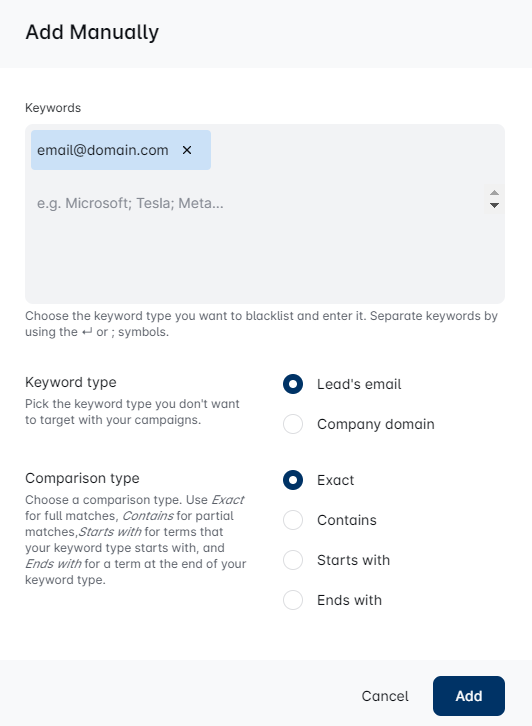Digite o email ou domínio da empresa aqui, use Enter para separar os valores e escolha o tipo correspondente (Email do lead ou Domínio da empresa, dependendo do que você escreveu). Escolha seu tipo de comparação e clique em Adicionar à Lista Negra.