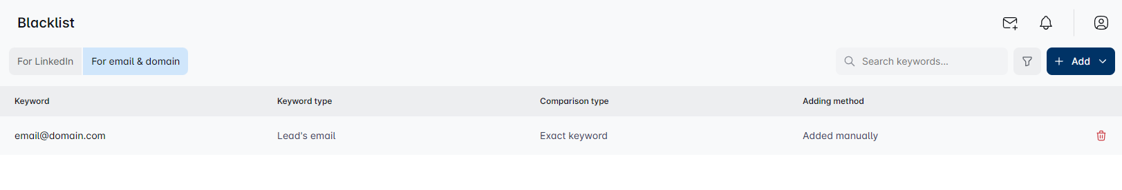 A partir daí, você pode adicionar à lista negra leads indesejados, empresas, e-mails e domínios usando a opção manual ou carregando um arquivo CSV.