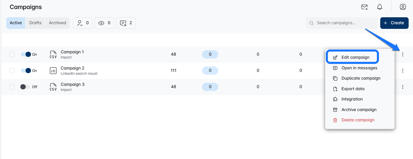 - Alternativamente, você pode entrar no modo de edição selecionando uma campanha e, em seguida, escolhendo a aba 'Editar Campanha' na página de Leads.