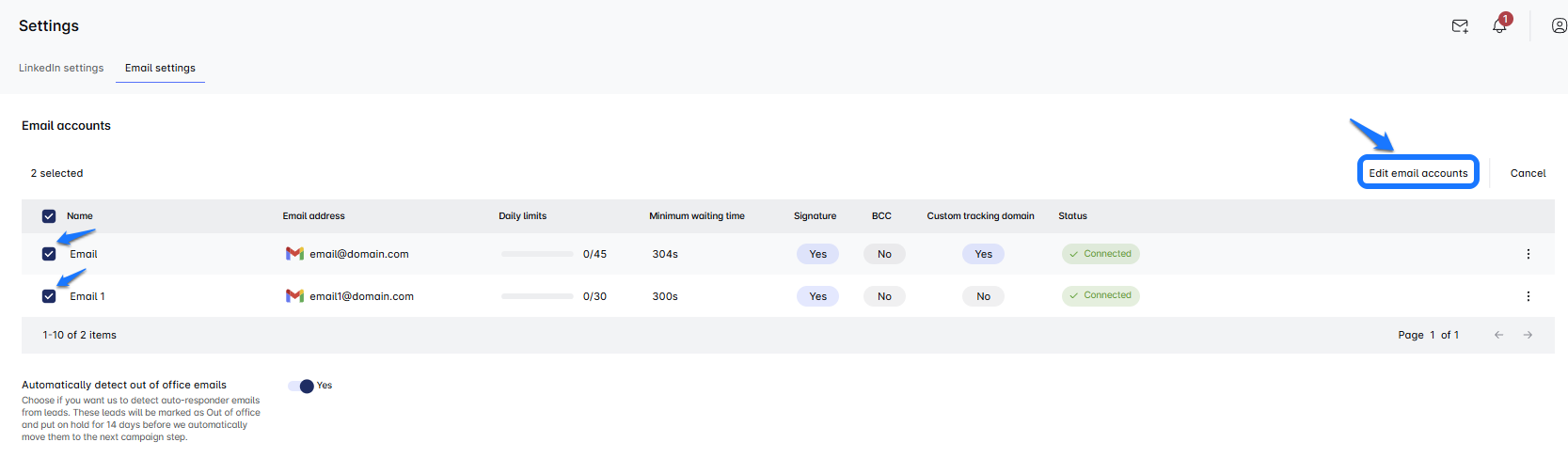 Öncelikle, Ayarlar sekmesine gidin ve E-posta Ayarları bölümünü bulun. Toplu olarak güncellemek istediğiniz e-posta hesaplarını seçin. -