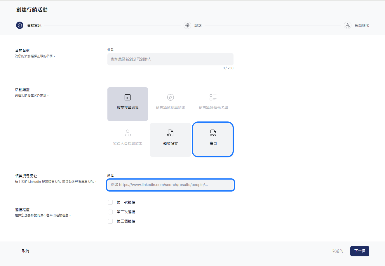- 作為團隊擁有者,您可以訪問所有團隊席位。要分享模板,請從開始一個活動過程。添加任何 LinkedIn 連結或一個空的 CSV 文件以通過初始活動設置。