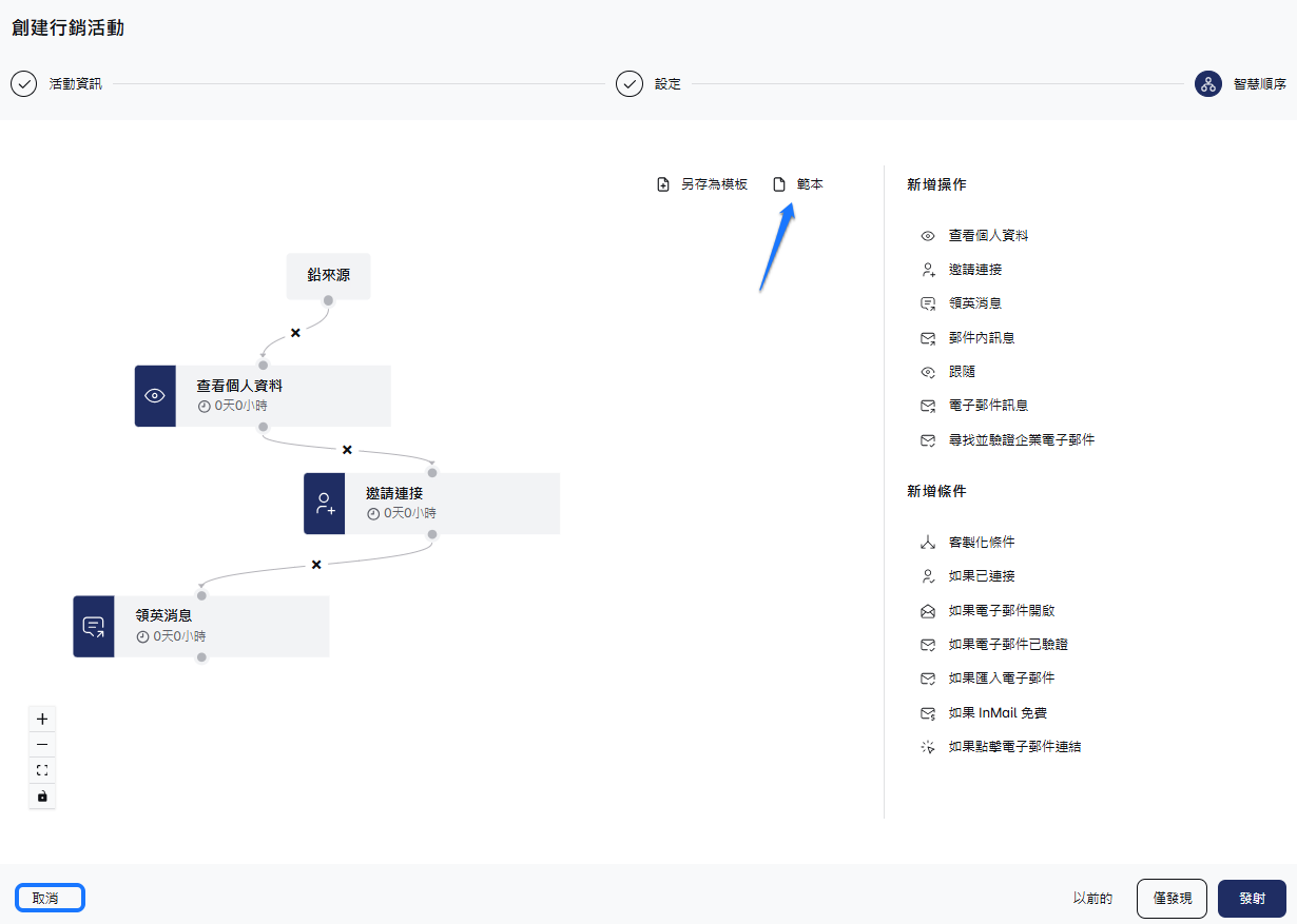 - 一旦進入Smart Sequence dashboard,點擊Templates按鈕並選擇您想分享的模板。平台會自動將此保存為活動設置的一部分。現在,只需點擊Cancel按鈕以退出畫面。